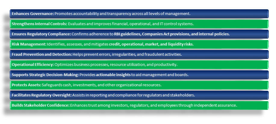 3. Regulatory Compliance: Ensures adherence to RBI guidelines, Companies Act, SEBI regulations, and internal policies.
