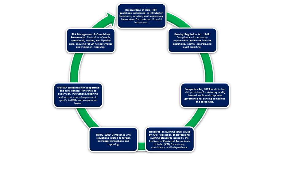 Our internal and bank audit services are conducted in strict compliance with Indian laws, regulatory guidelines, and professional standards to ensure accuracy, transparency, and reliability. Key frameworks and standards include: